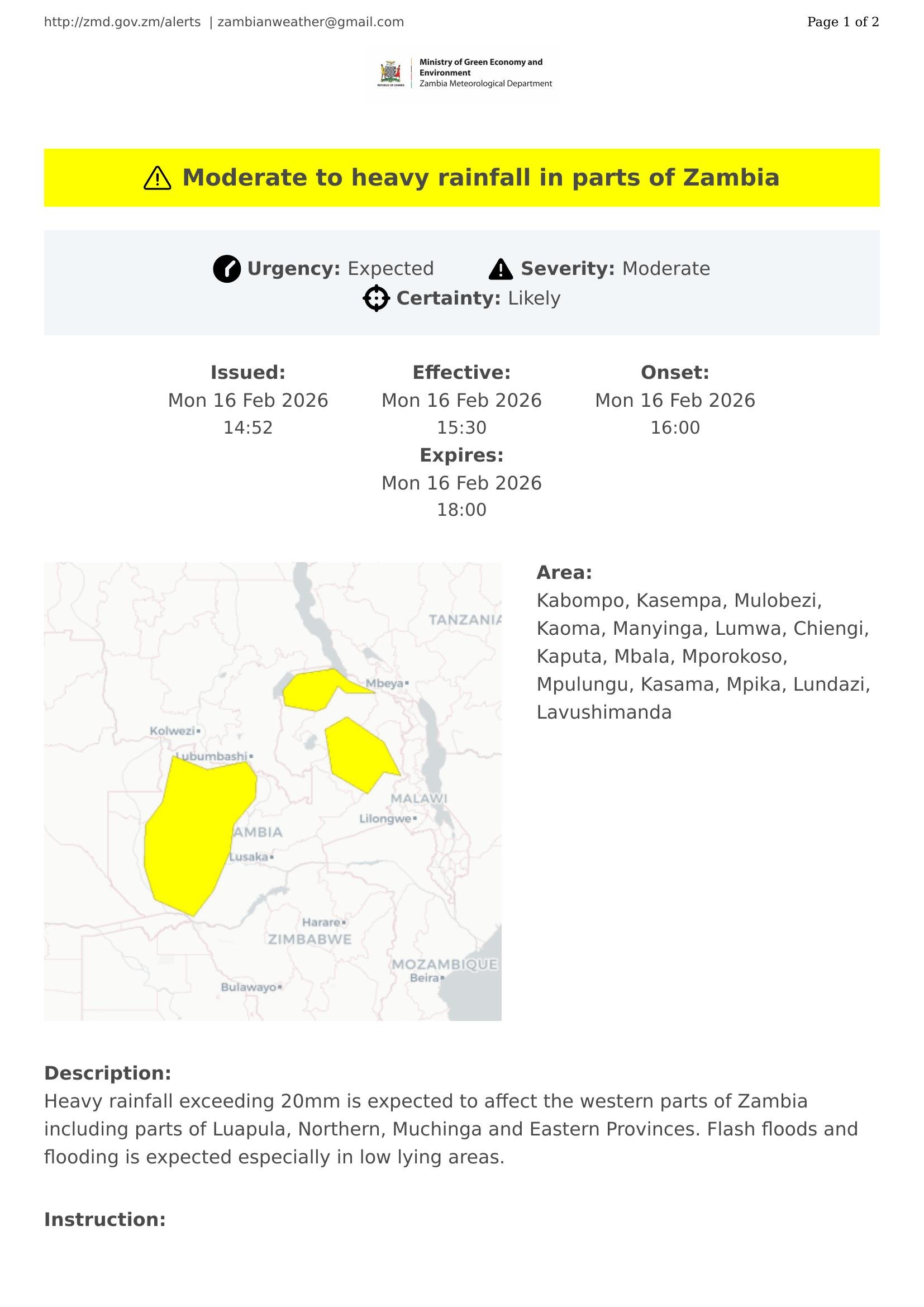Heavy rainfall exceeding 20mm is expected to affect the western parts of Zambia including parts of Luapula, Northern, Muchinga and Eastern Provinces. Flash floods and flooding is expected especially in low lying areas.
