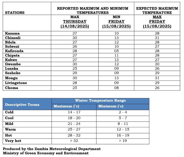 - Kasempa 04°C, Kafironda 05°C, Livingstone, Sesheke, Kenneth Kaunda International Airport 09°C, Kasama, Isoka, Solwezi and Senanga 10°C, Mt. Makulu and Chipata 11°C.