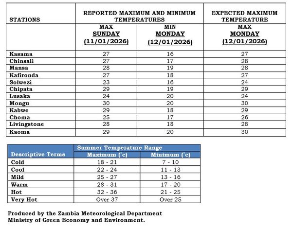 ZAMBIA LUNCHTIME WEATHER REPORT: MONDAY (12/01/2026)