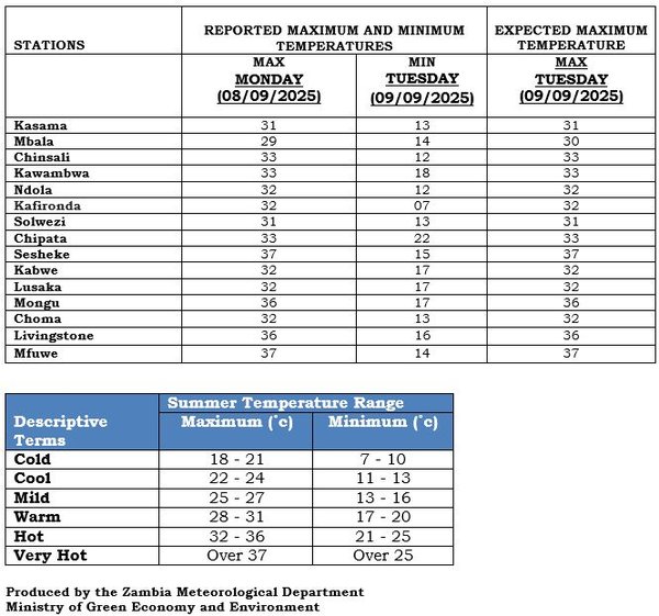 Mfuwe and Sesheke 37°C, Senanga, Livingstone and Mongu 36°C, Magoye and Zambezi 34°C, Chipepo, Mumbwa and Chinsali 33°C, Isoka, Kafironda, Ndola, Lundazi, Kabwe met, Mt Makulu and Choma 32°C.