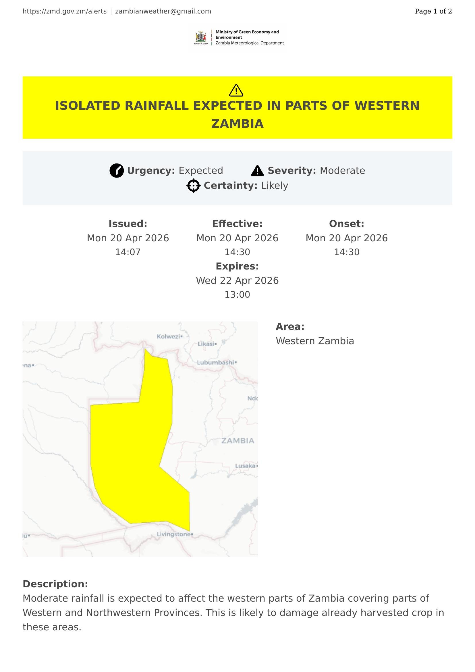Moderate rainfall is expected to affect the western parts of Zambia covering parts of Western and Northwestern Provinces. This is likely to damage already harvested crop in these areas.